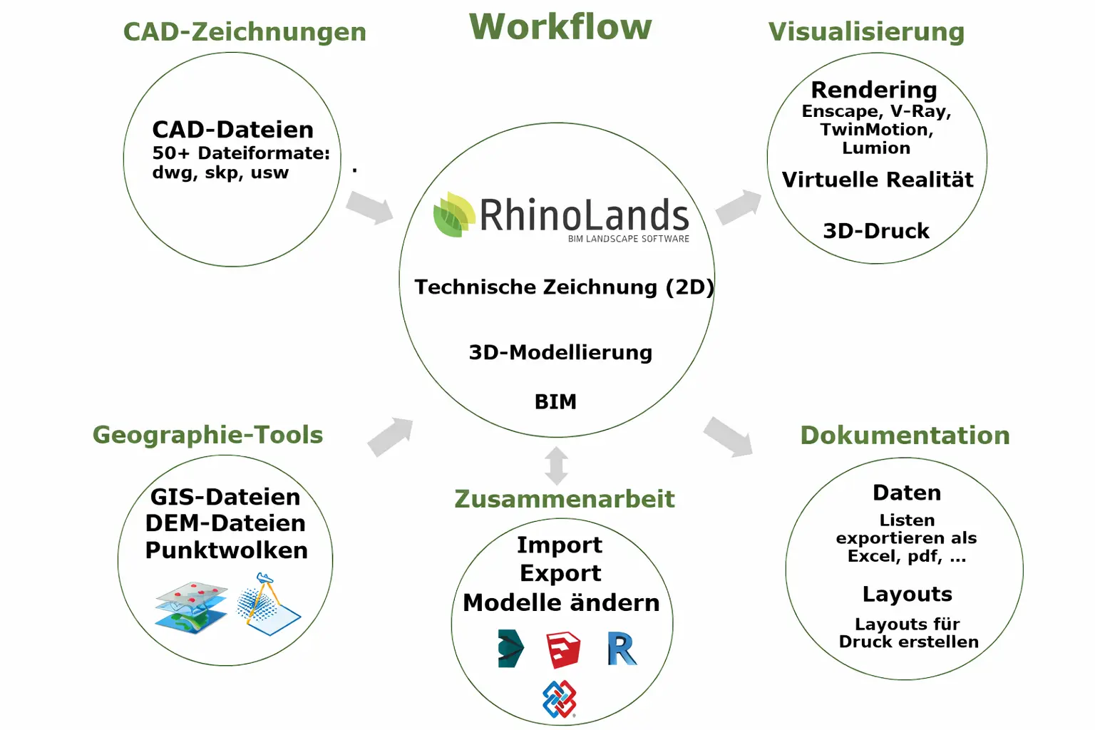 Dank der Unterstützung zahlreicher Formate wie IFC, DWG, SKP oder 3DM sowie der Kompatibilität zu führenden Render-Engines wie Enscape, V-Ray, Twinmotion und Lumion lässt sich Lands Design flexibel in bestehende AEC-Workflows integrieren.